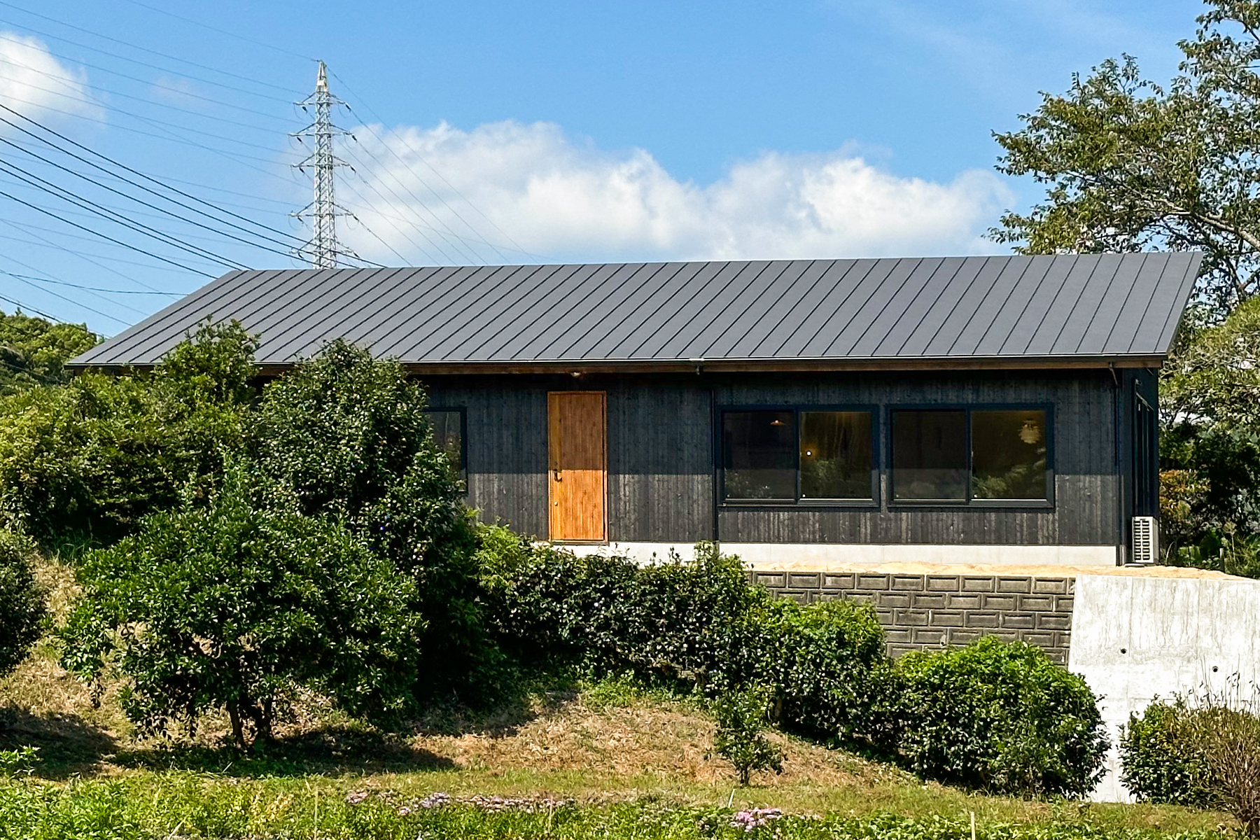 ガルバリウムの屋根と焼杉の外壁に玄関ドアが映える外観